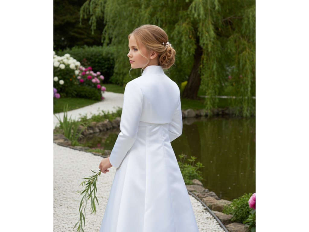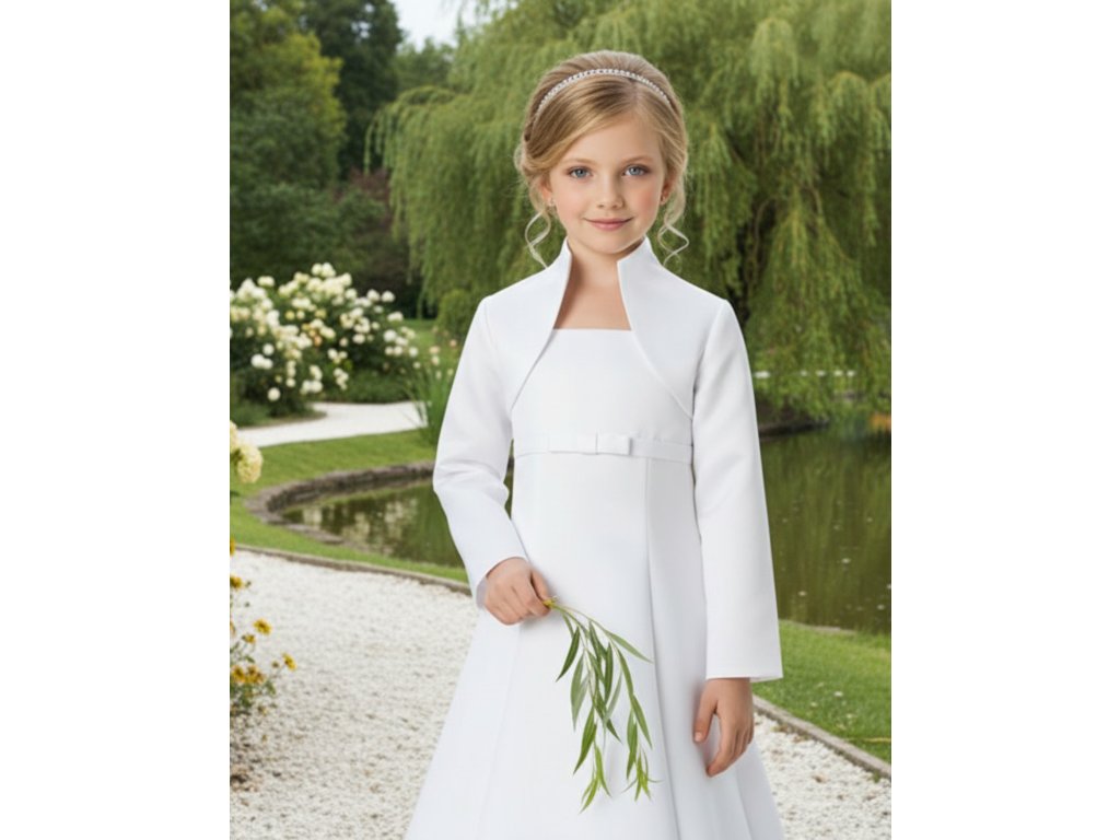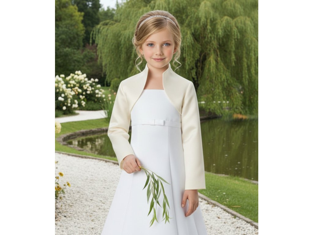 Dětské saténové svatební bolerko s vyšším límcem a dlouhým rukávem.
