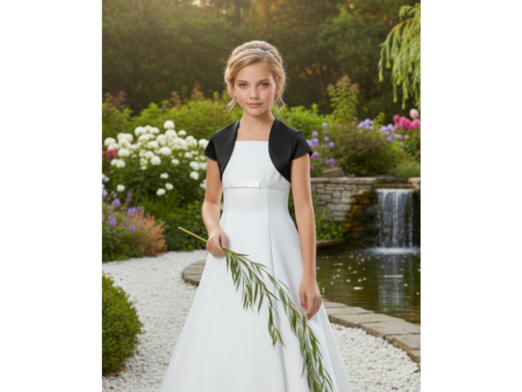Dětské saténové svatební bolerko s krátkým rukávem.