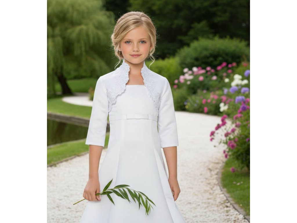 Dětské saténové svatební bolerko zdobené krajkou.