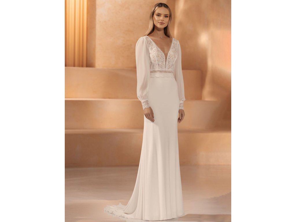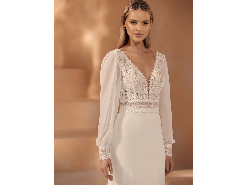 Dvoudílné svatební šaty s dlouhým rukávem.