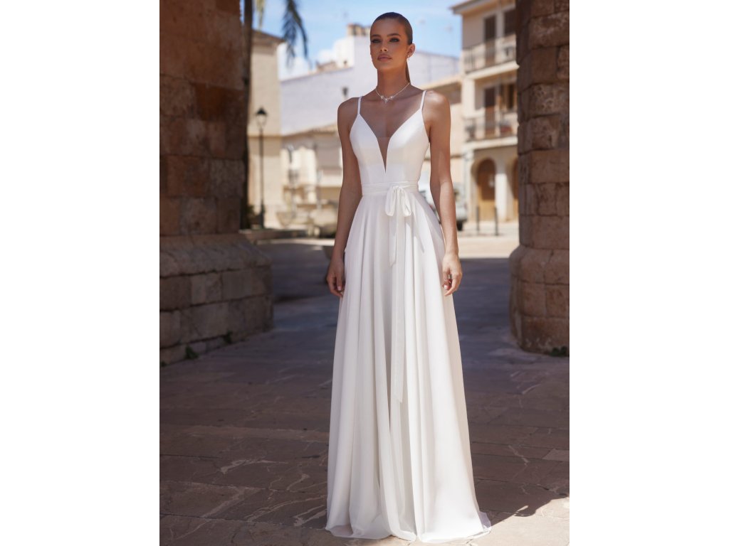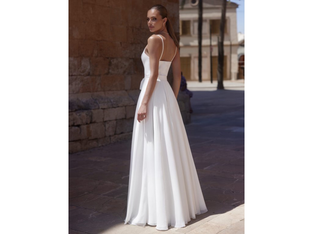 Dvoudílné svatební šaty se saténovým topem a šifonovou sukní.
