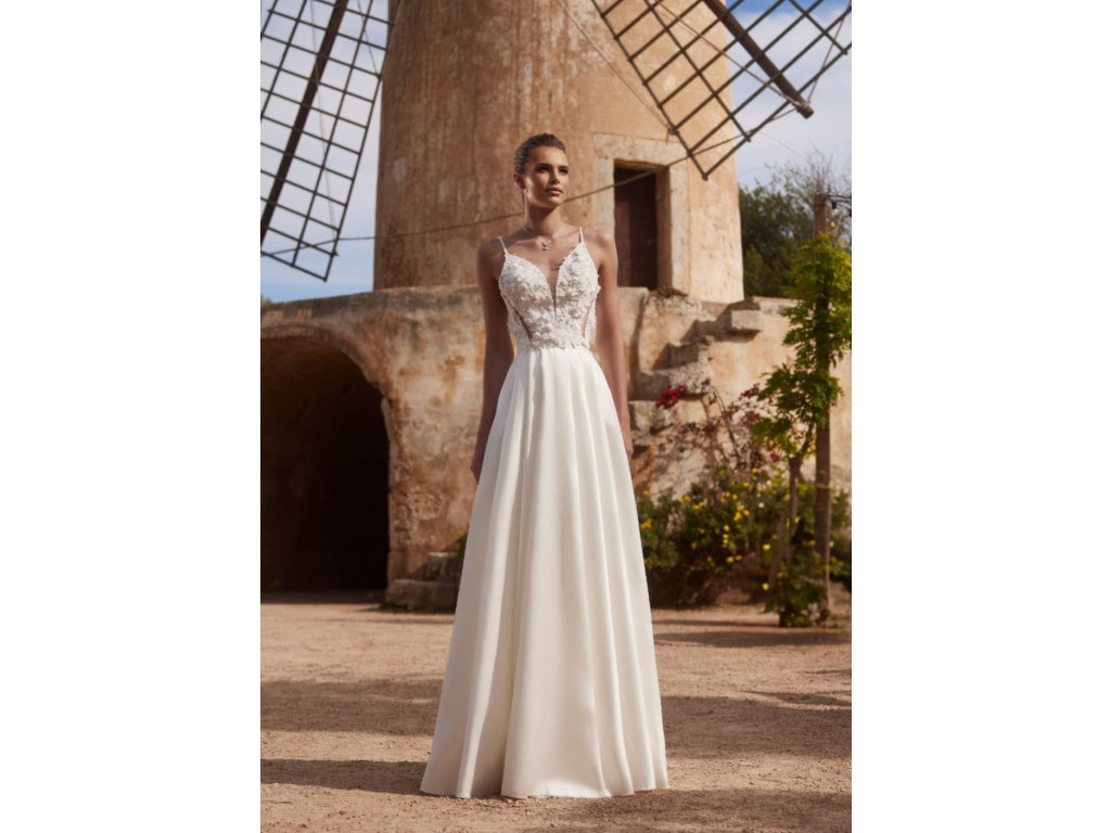 Dvoudílné svatební šaty s krajkovým topem a saténovou sukní.