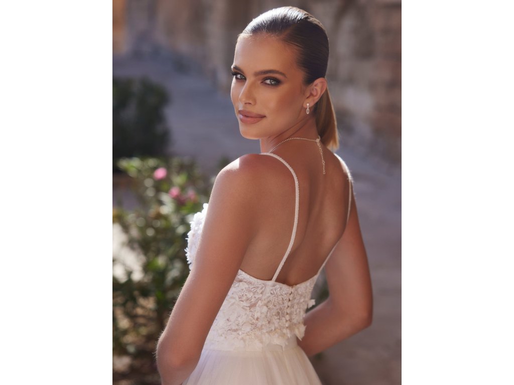 Horní část šatů tvoří luxusní krajkový svatební top zdobený 3D květy.
