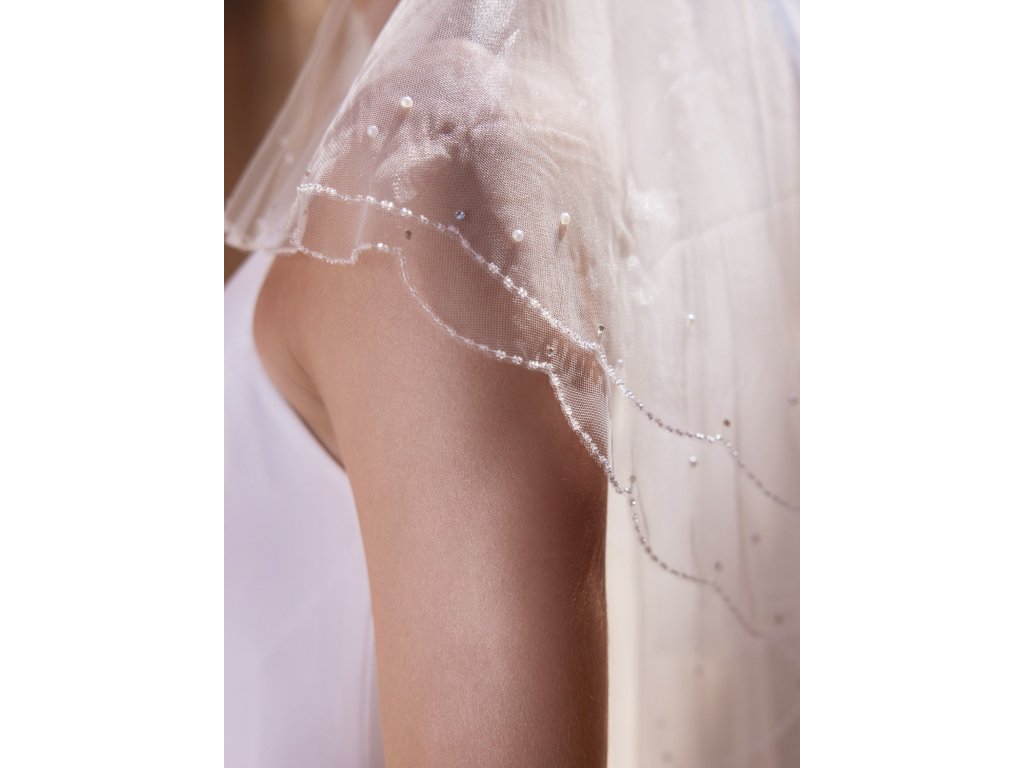 Dvouvrstvý svatební závoj s korálkovým lemem, zdobený umělými perlami.