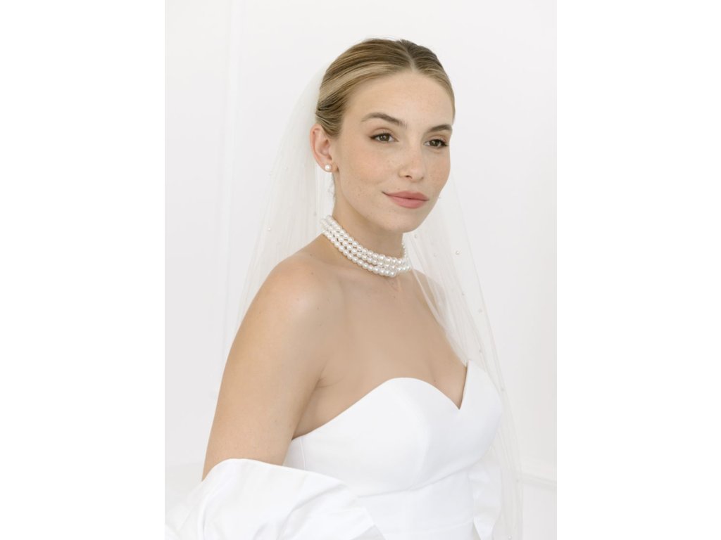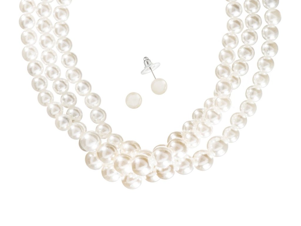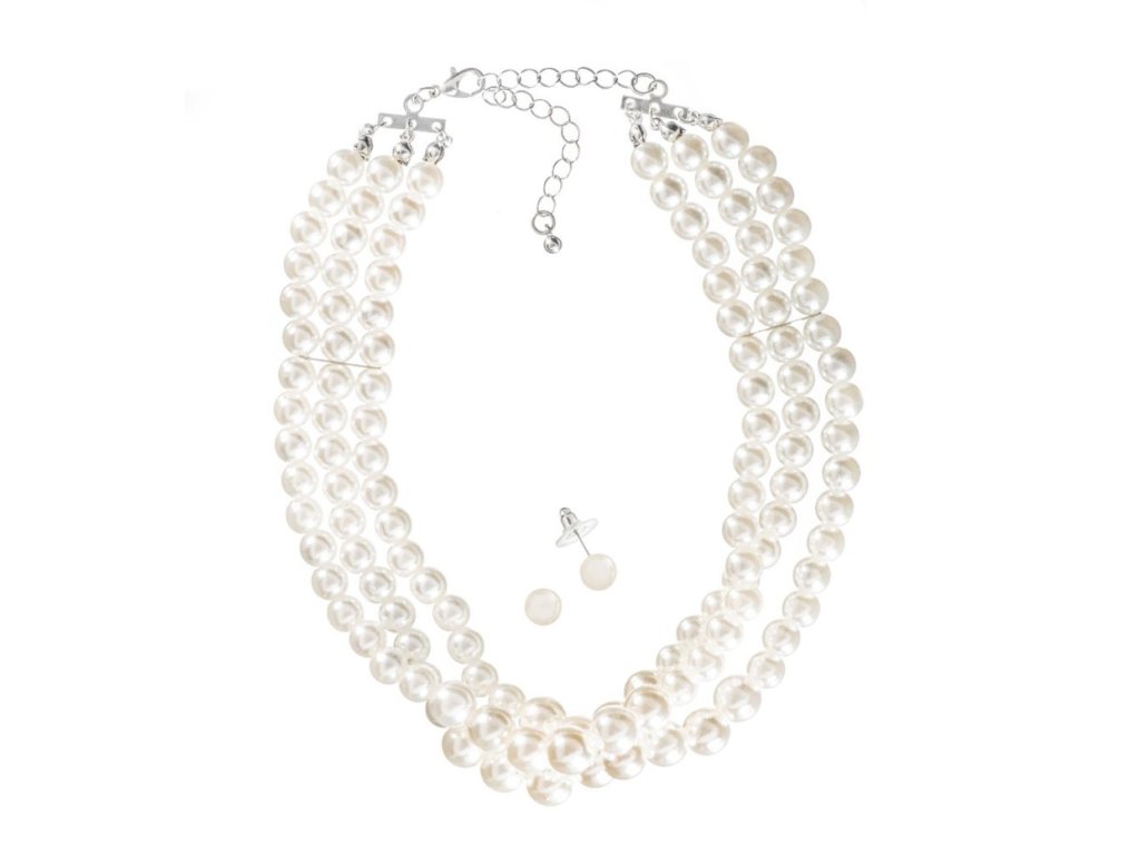 Svatební perlová sada trojřadého svatebního náhrdelníku a náušnic. Umělé perly jsou v barvě off-white.