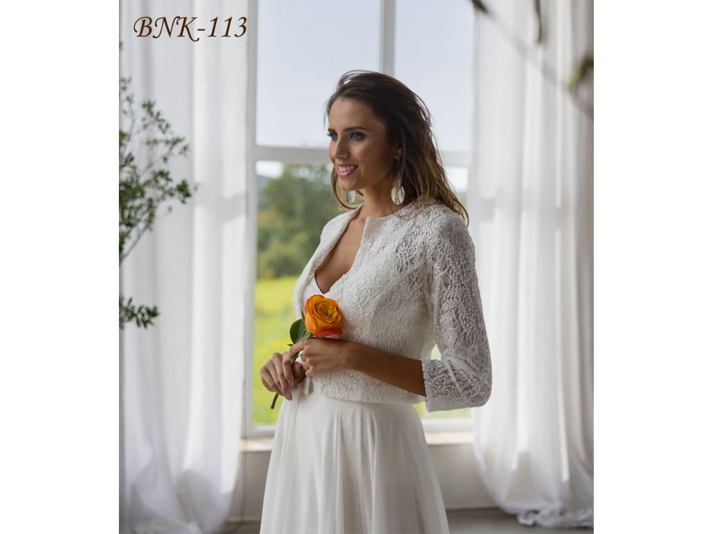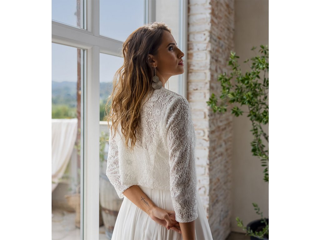 Elegantní krajkový svatební kabátek s 3/4 rukávy.