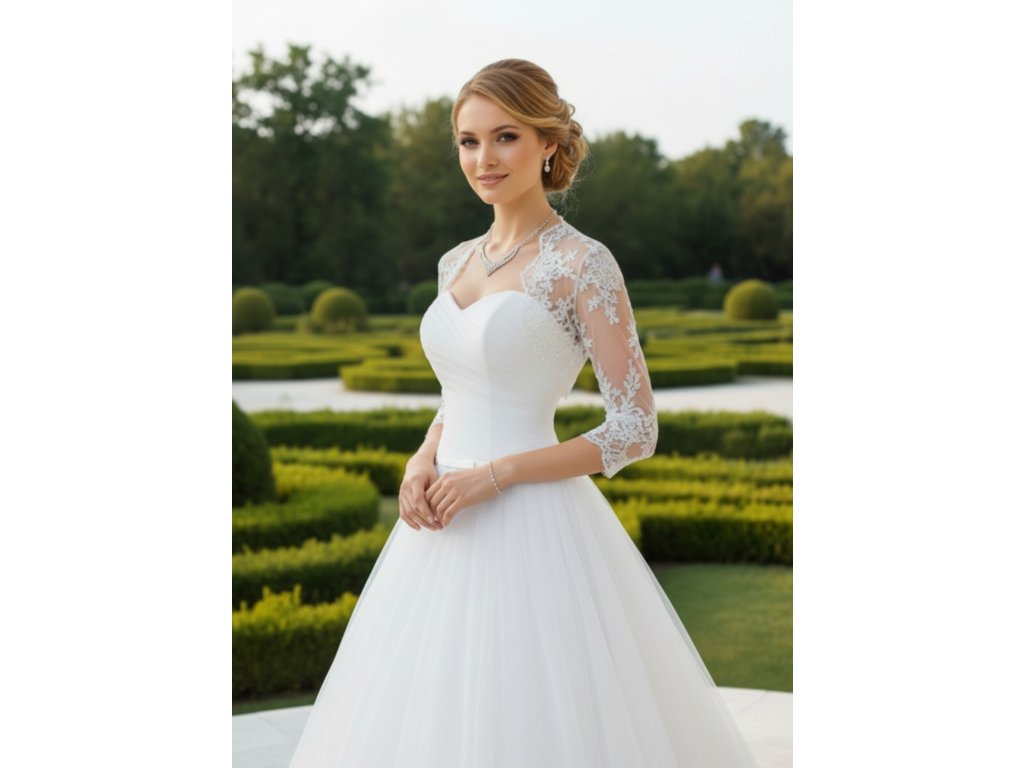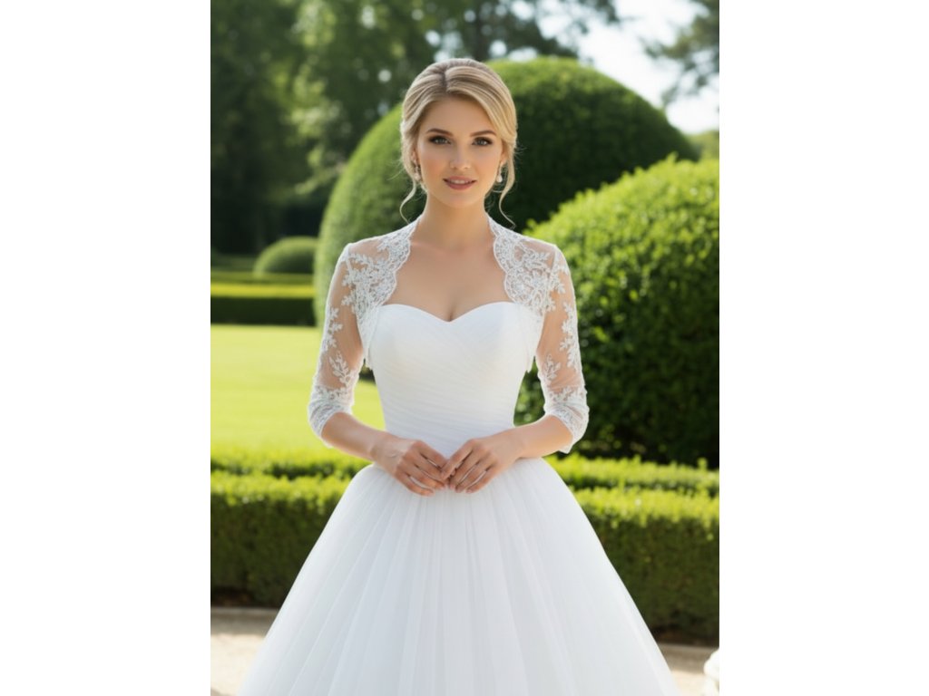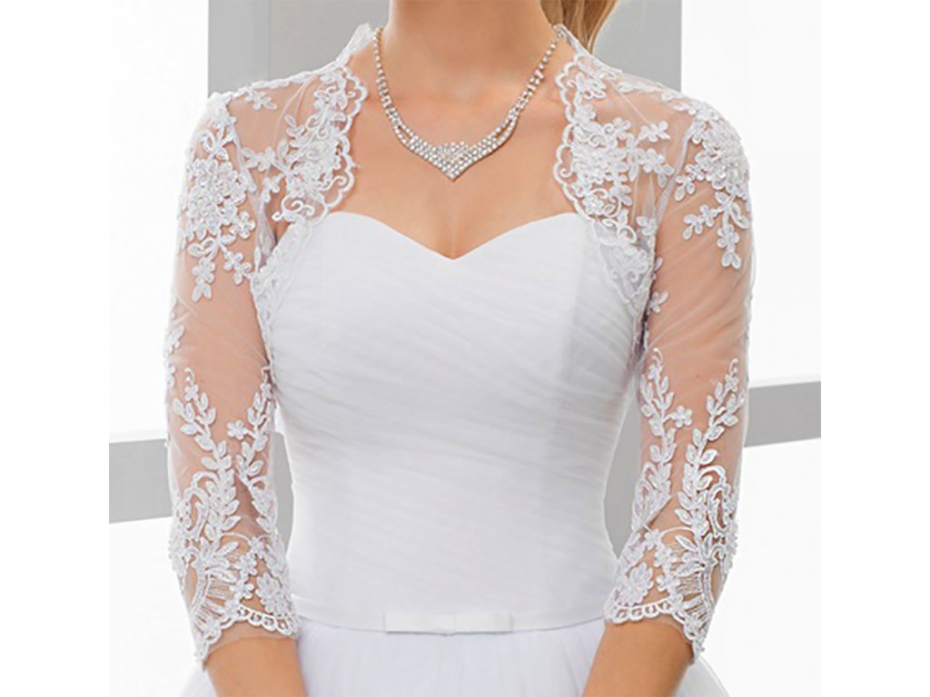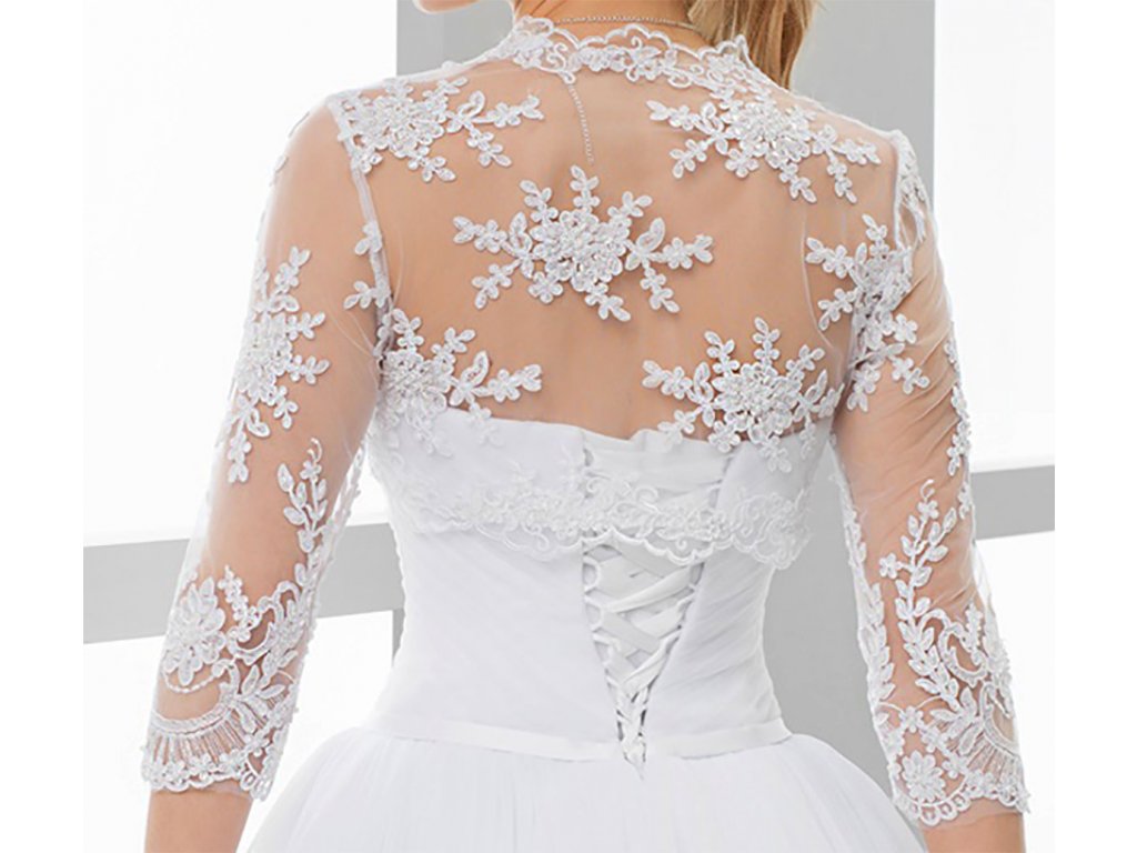 Krajkové svatební bolerko s 3/4 rukávy.
