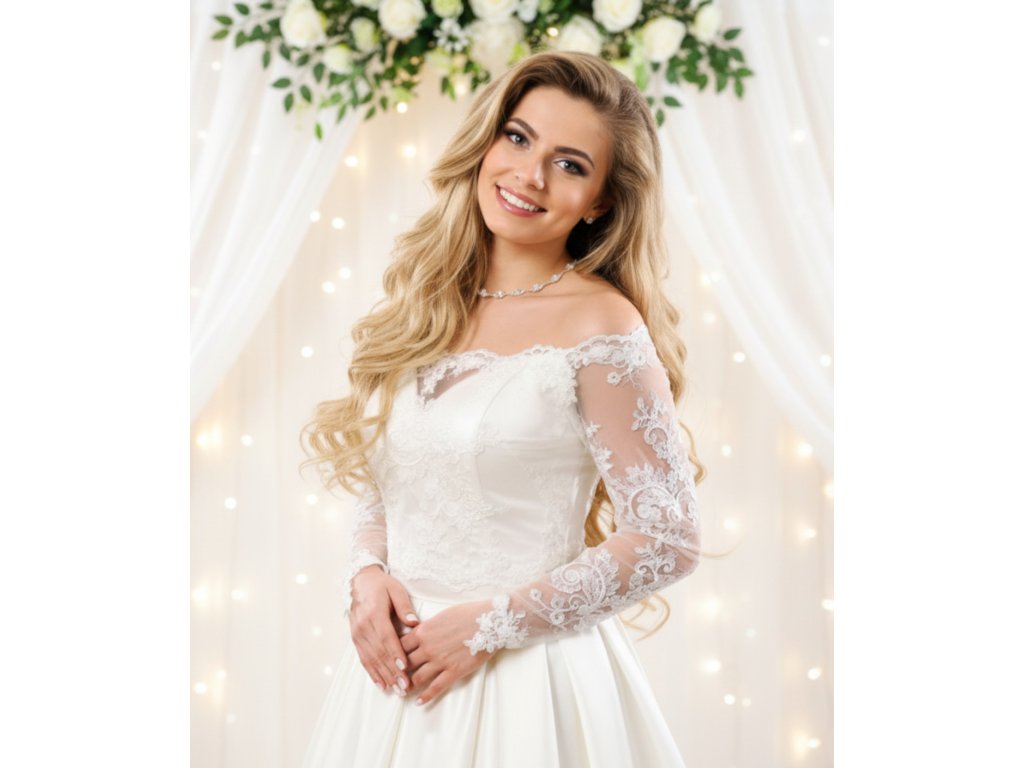 Krajkový svatební kabátek s dlouhým rukávem.