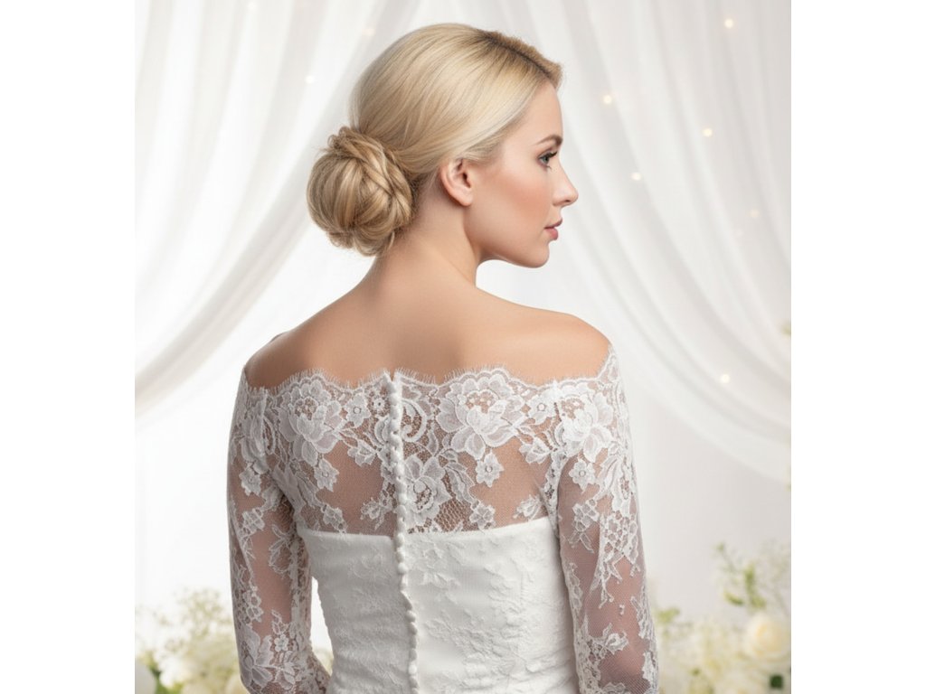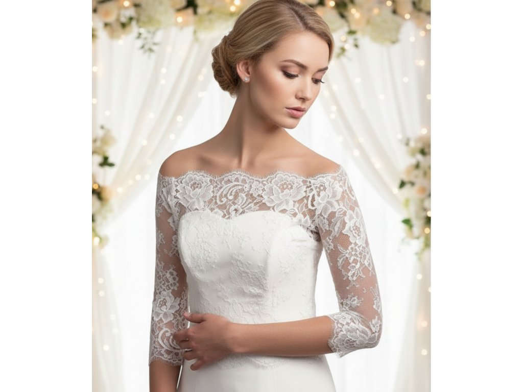 Krajkový svatební kabátek z francouzské krajky s květinovým vzorem.