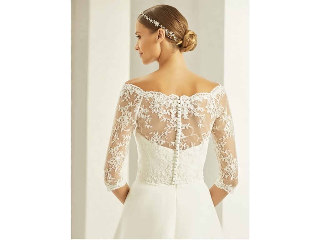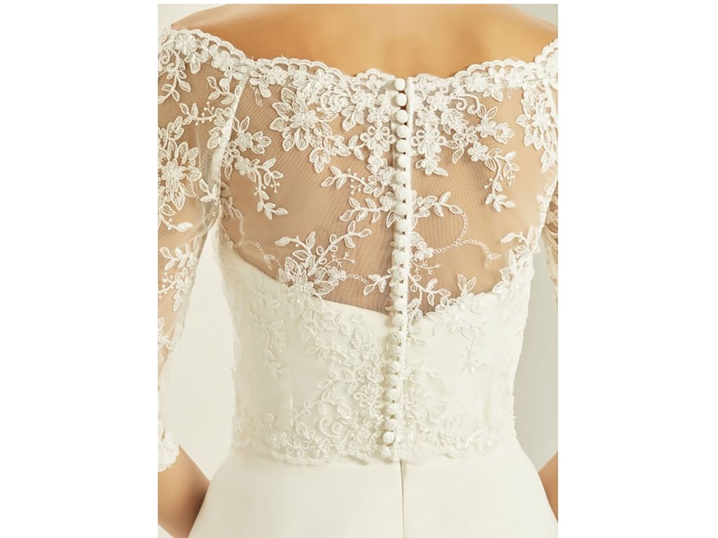 Krajkový svatební kabátek zdobený korálky.