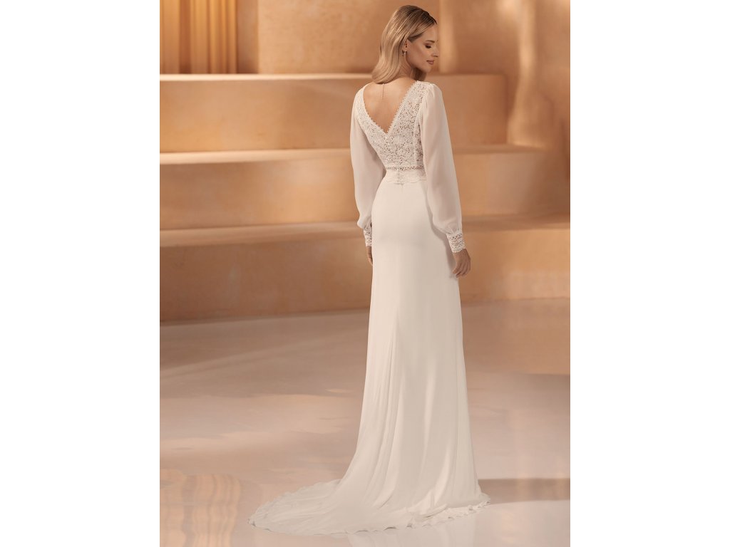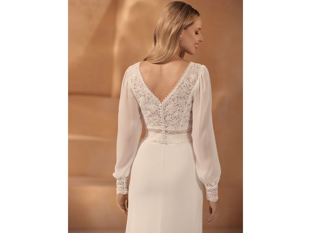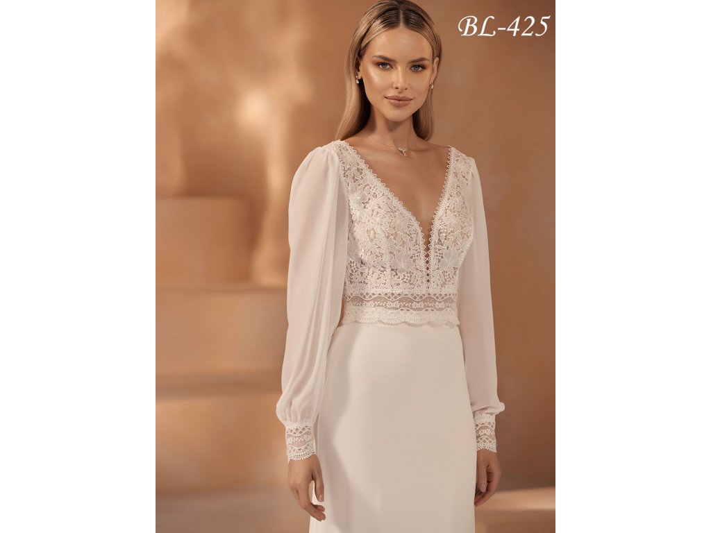 Luxusní krajkový svatební kabátek s dlouhými šifonovými rukávy.
