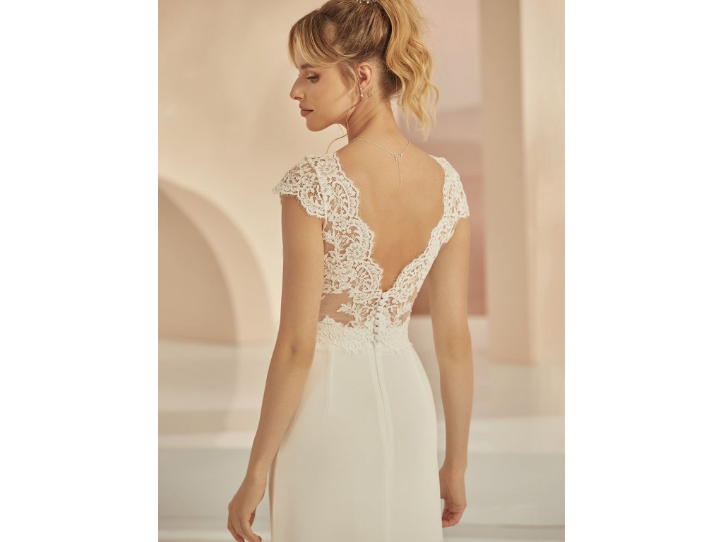 Vzadu zapínání na knoflíčky potažené krajkou.