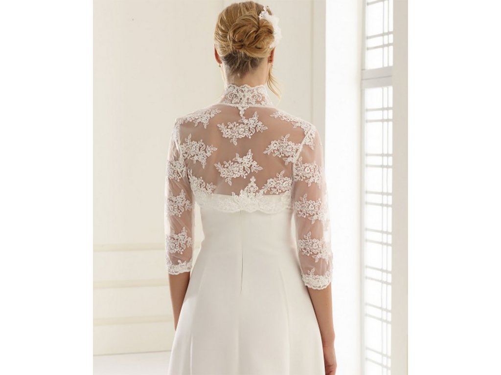 Krajkové svatební bolerko s 3/4 rukávem, ručně vyšívané drobnými skleněnými korálky.