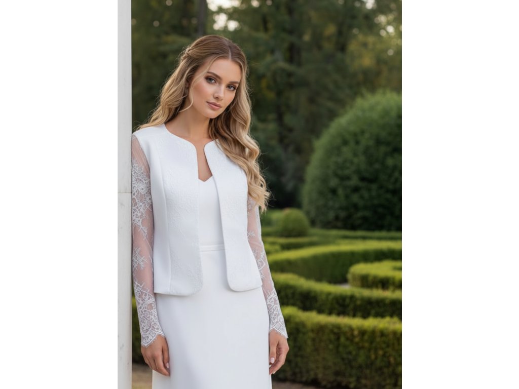 Saténové svatební bolerko s krajkovými rukávy.