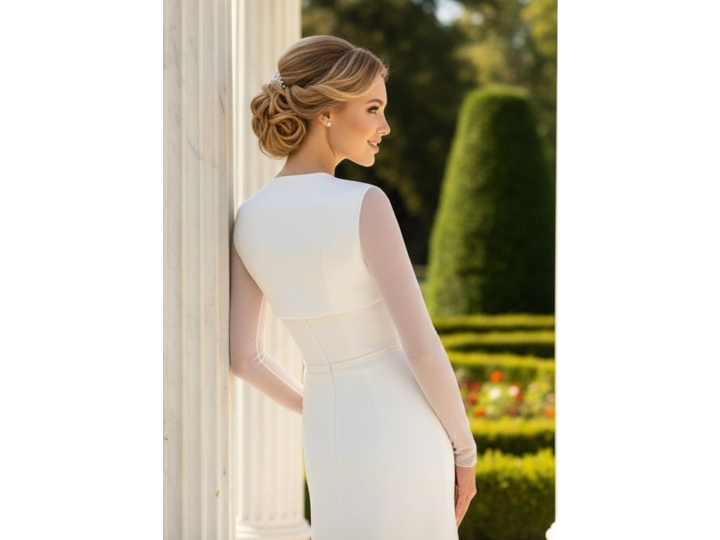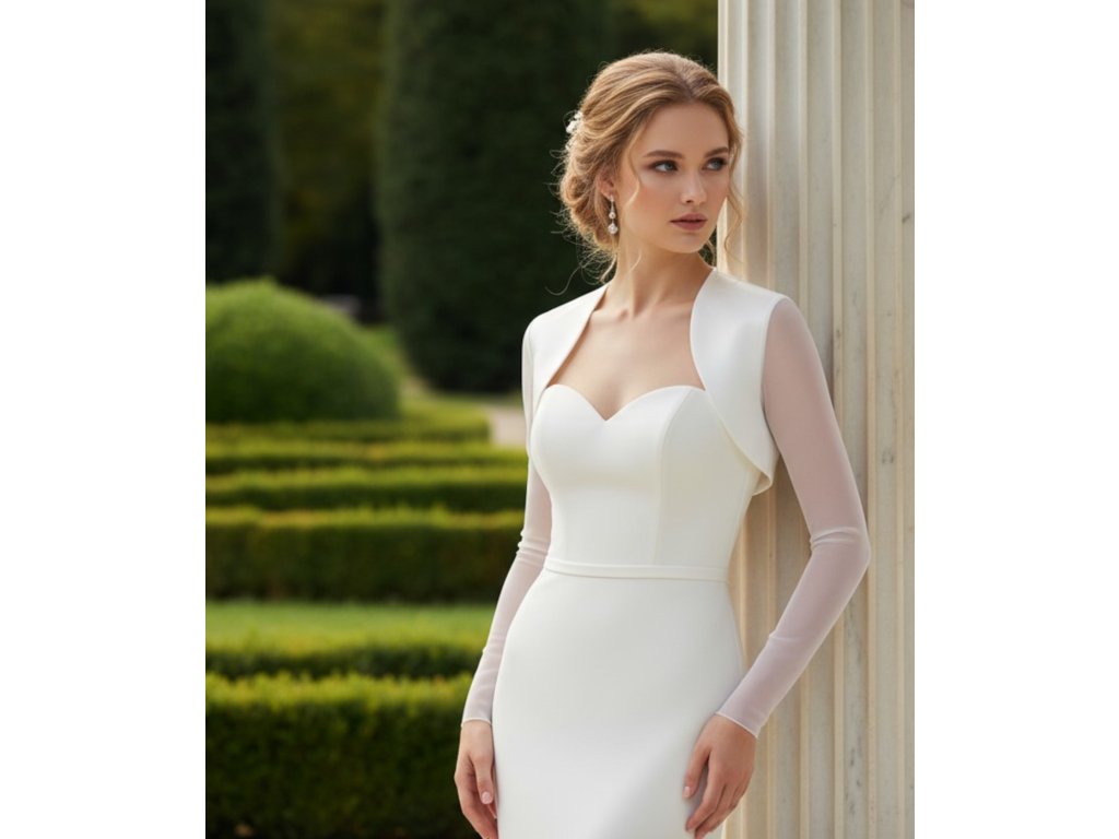 Saténové svatební bolerko s dlouhými rukávy z elastického tylu.