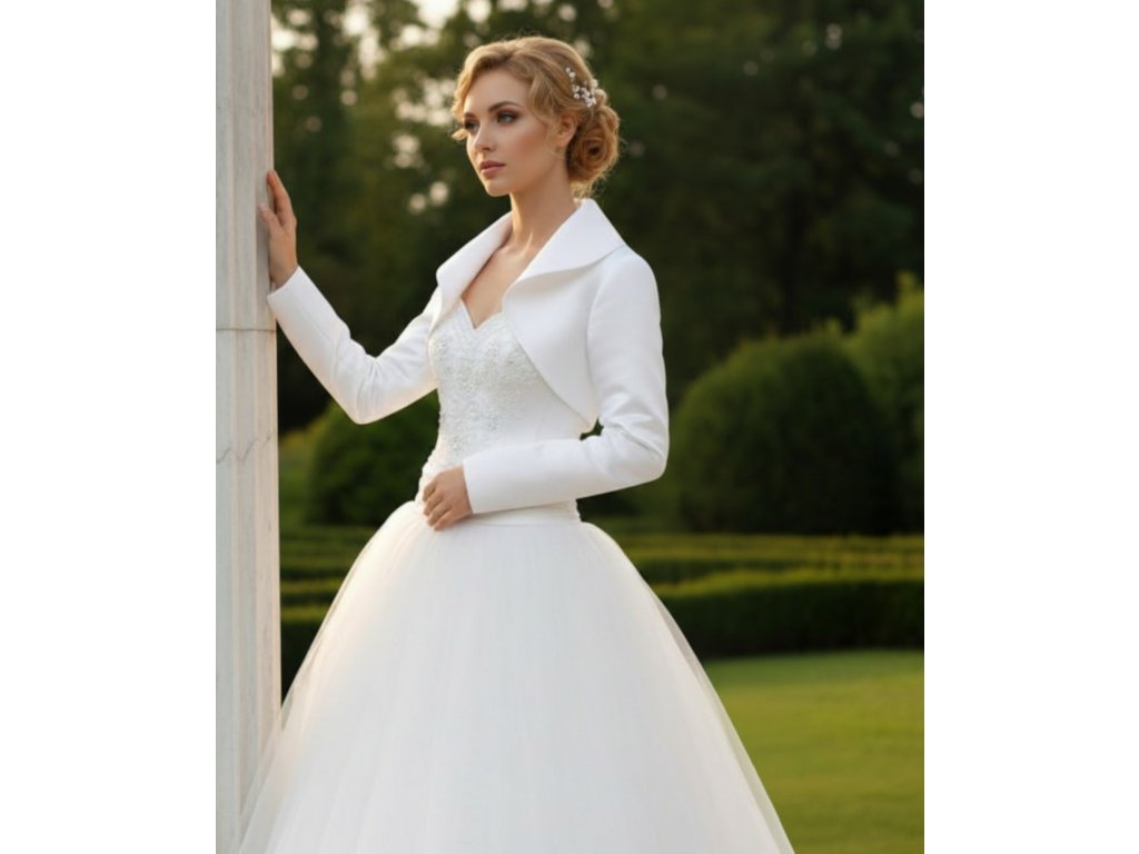 Saténové svatební bolerko s límcem a dlouhým rukávem.