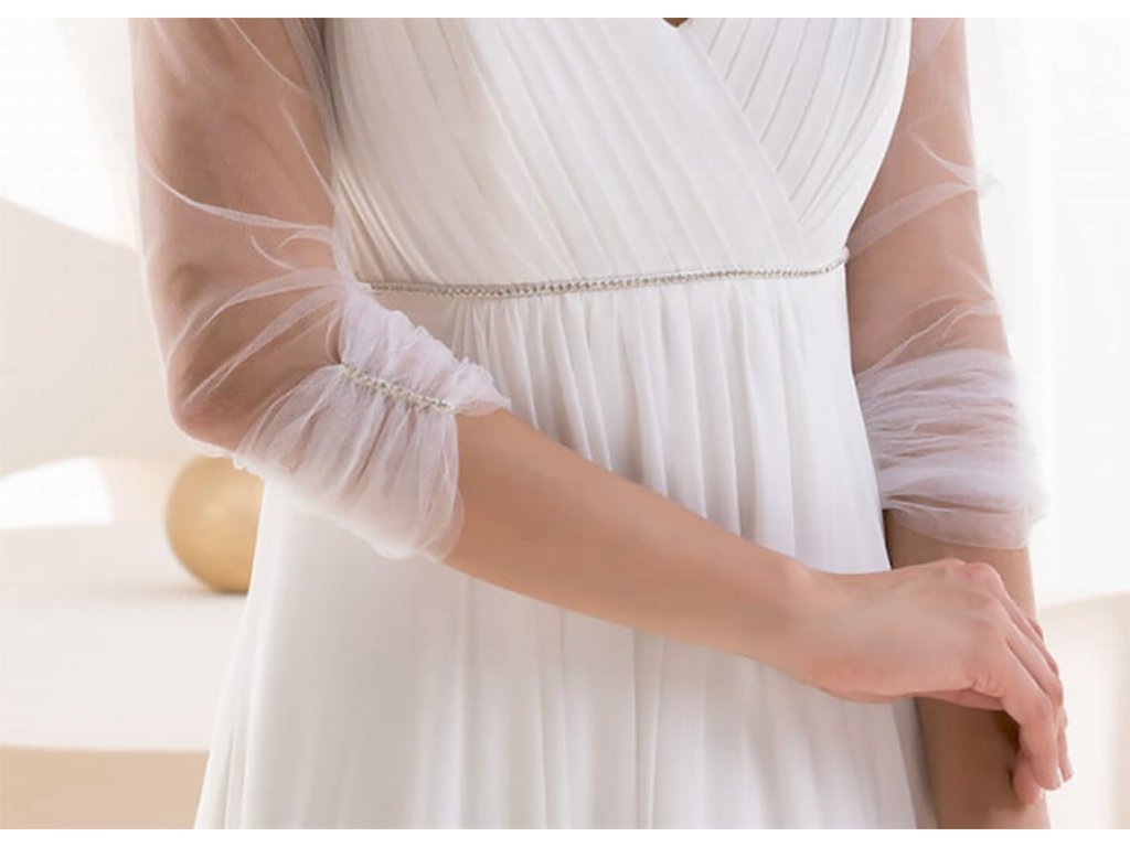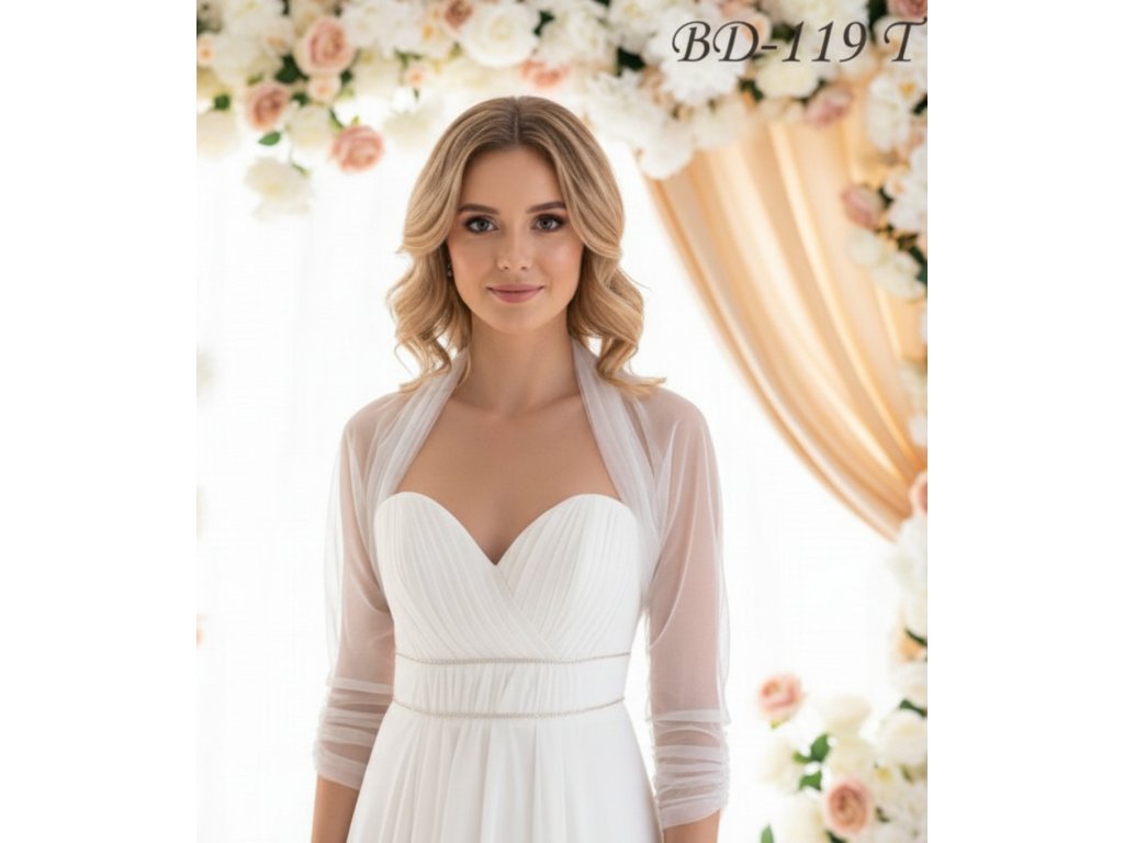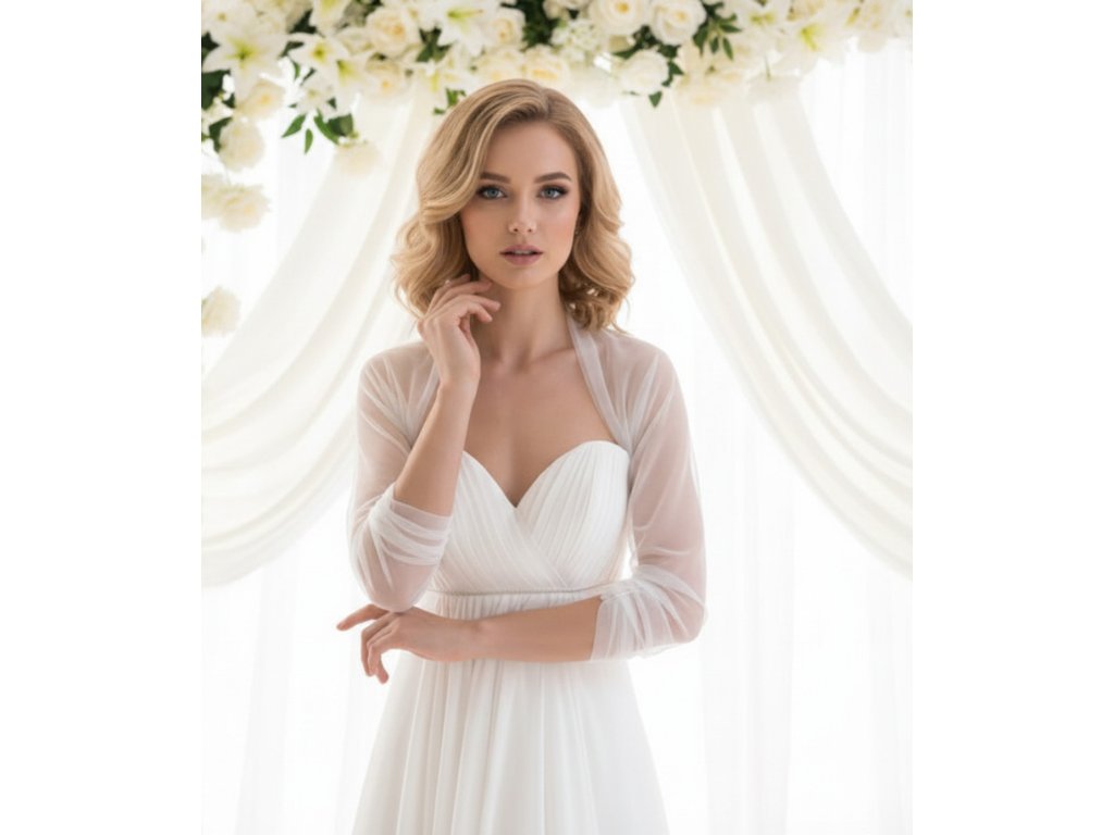 Skládané tylové svatební bolerko s 3/4 rukávem.