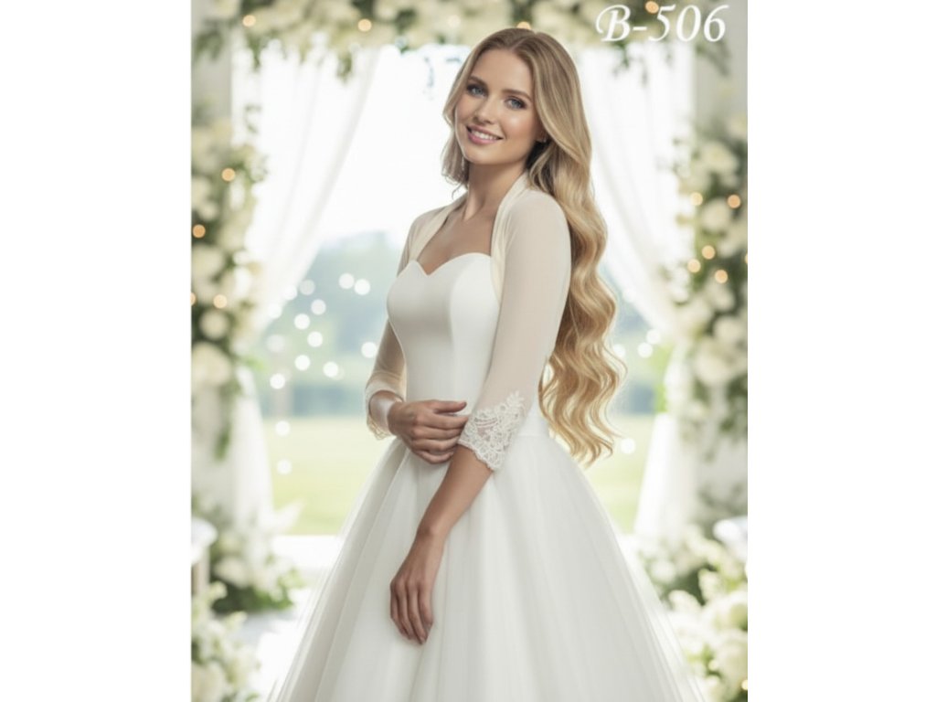 Svatební bolerko z elastického tylu zdobené krajkovou aplikací na rukávech.