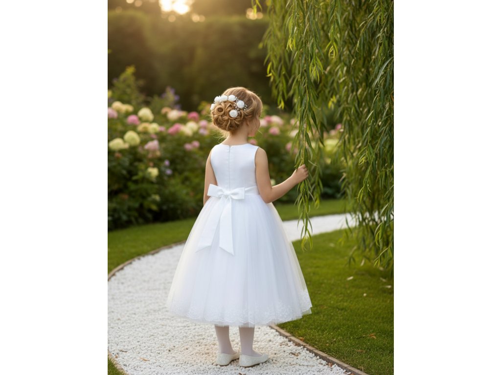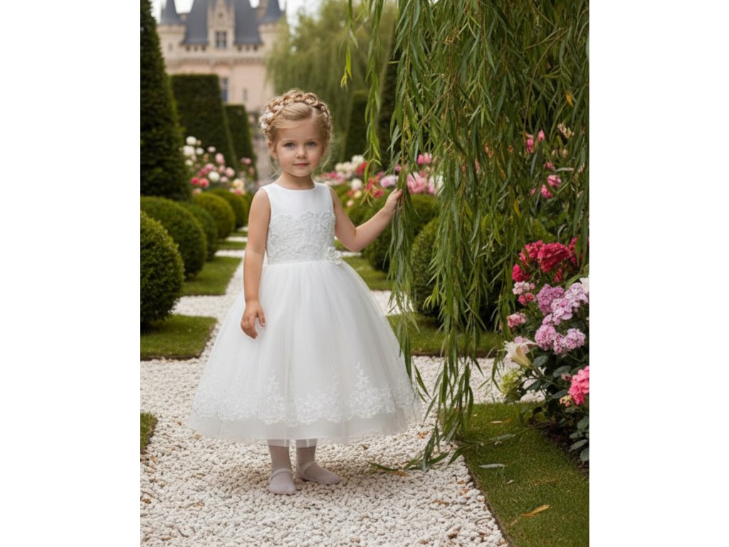 Dětské šatičky pro družičku, s krajkovým vrchním dílem a tylovou sukní lemovanou krajkou.