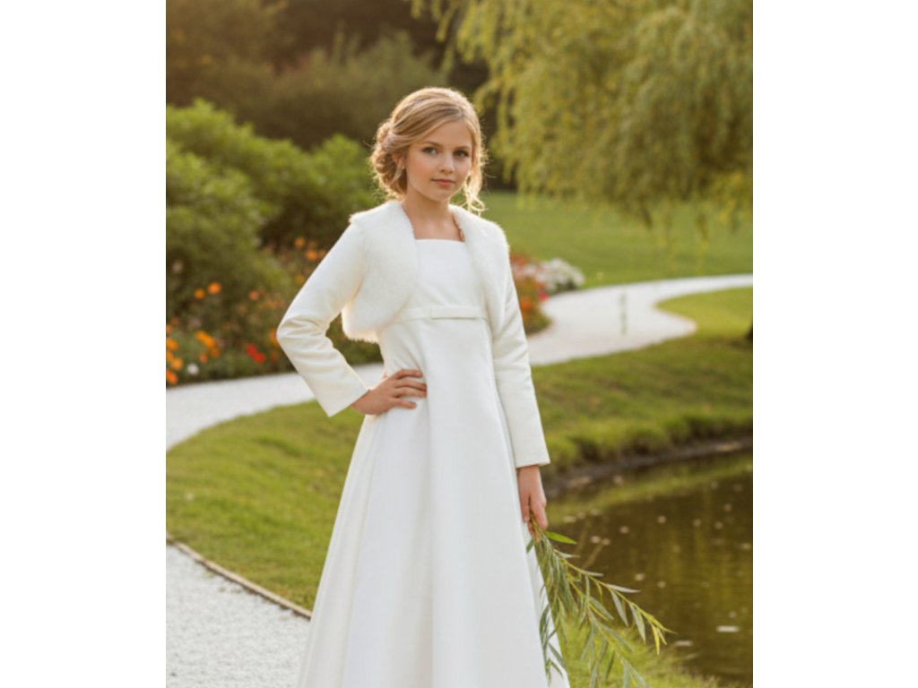 Dětský svatební kožíšek se saténovými rukávy.