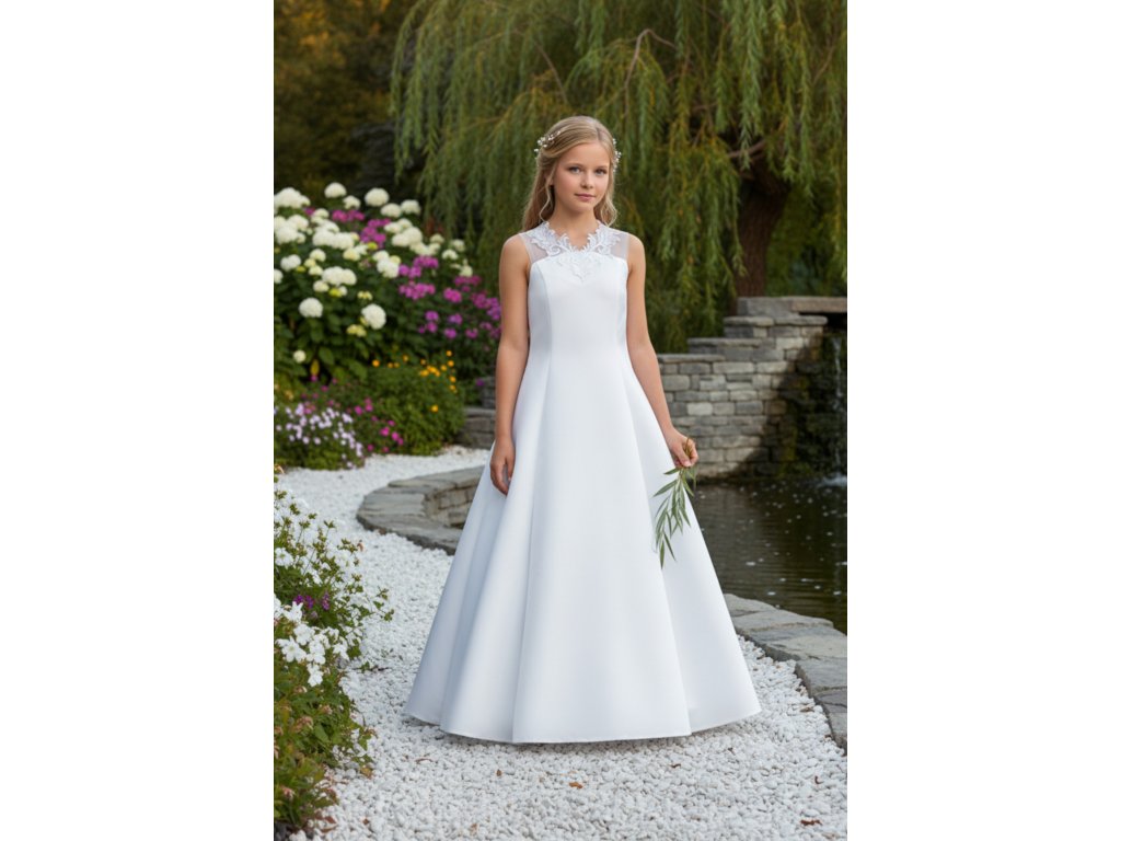Saténové dívčí šaty pro družičku, zdobené krajkovou aplikací.