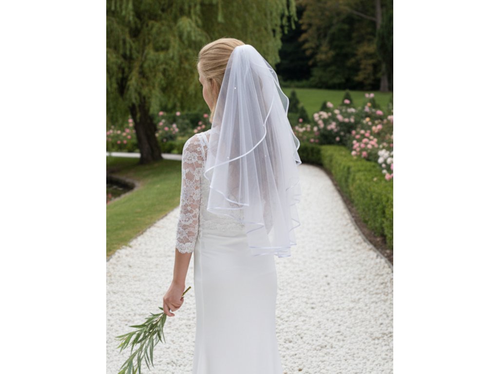 Jednoduchý dětský svatební závoj se saténovým lemem zdobený perličkami.