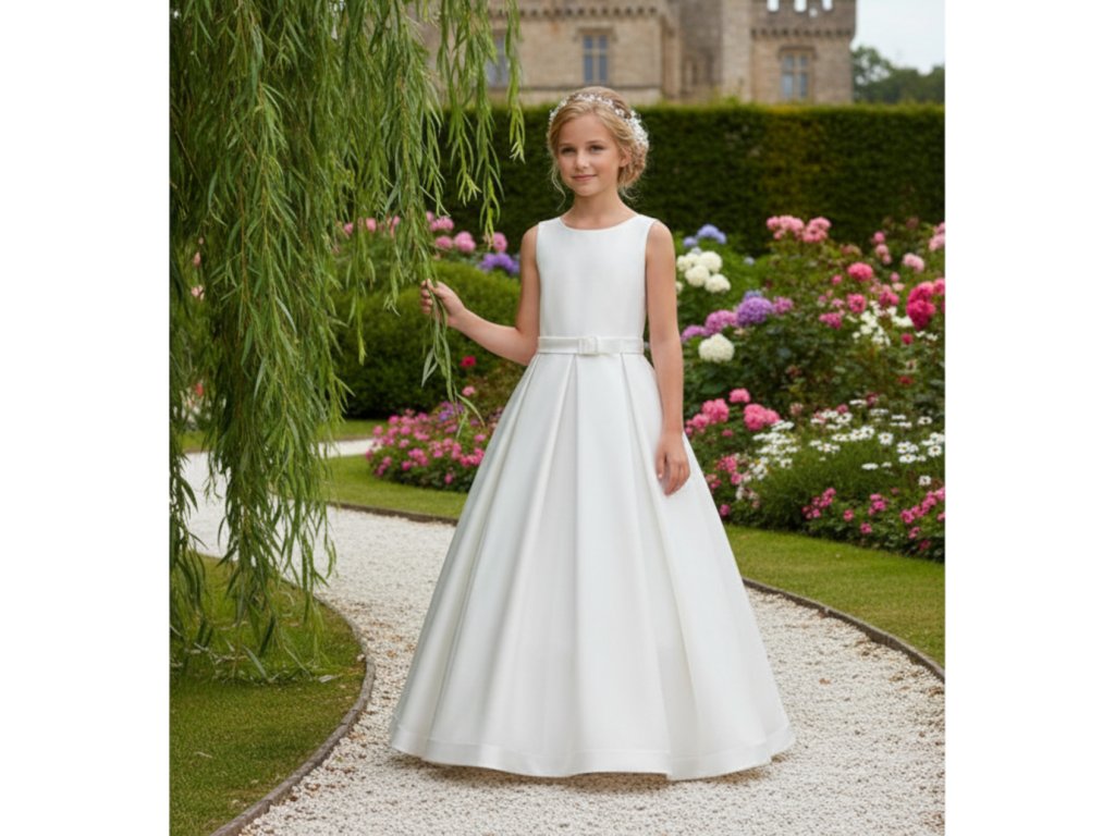 Saténové dívčí šaty pro družičky, v pase zdobené mašlí.