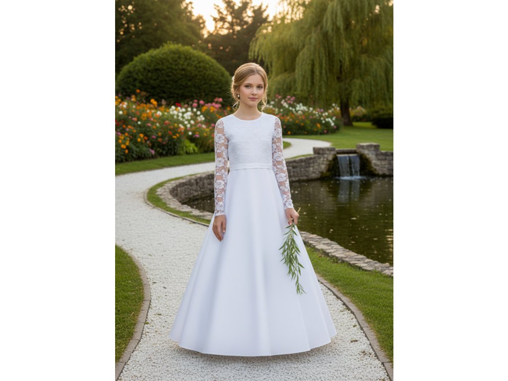 Saténové šatičky pro družičku, s krajkovým topem a dlouhými rukávy.
