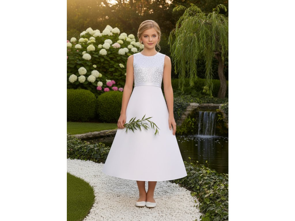 Saténové šatičky pro družičku, s topem vyšívaným stříbrnými flitry. Vhodné také pro první svaté přijímání.