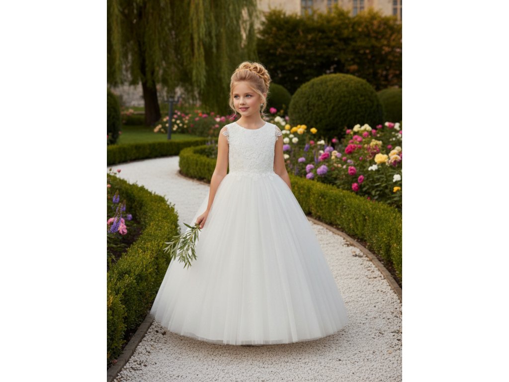 Dětské šatičky pro družičku s krajkovým vrchním dílem a tylovou sukní.