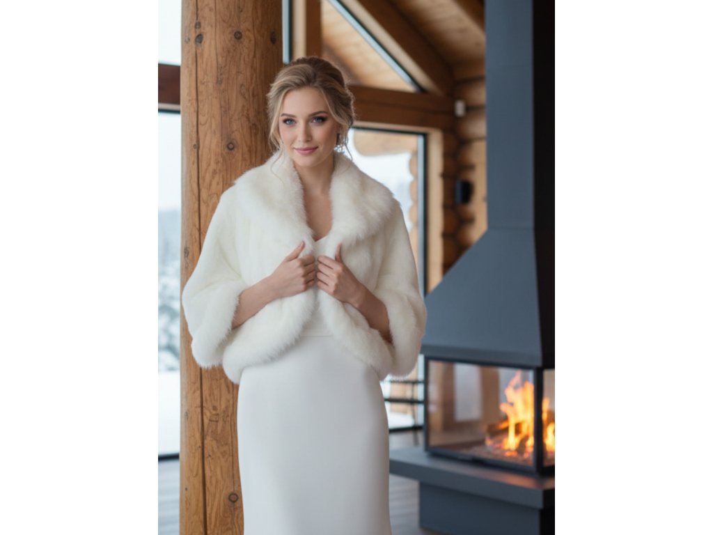 Svatební kožíšek se širokými rukávy. Kožíšek je vyrobený z umělé kožešiny.