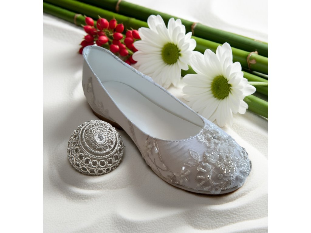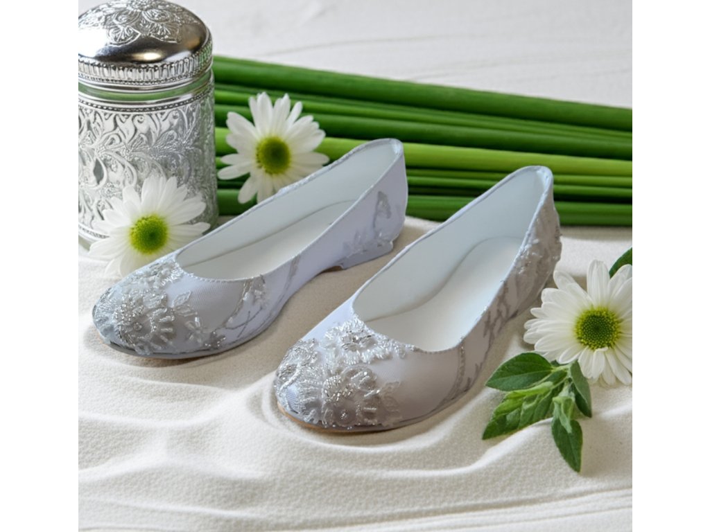 Svatební balerínky s krajkou zdobenou korálky a stříbrnou výšivkou