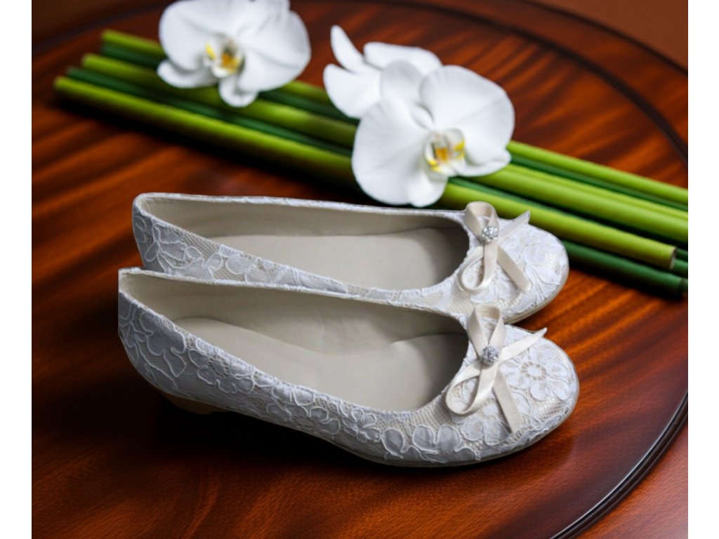 Krajkové svatební baleríny zdobené krystalovou sponou a mašlí.
