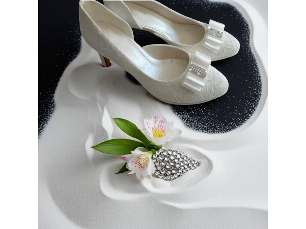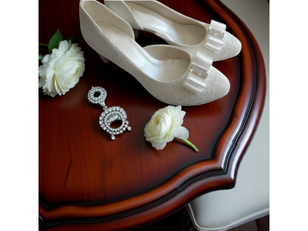 Krajkové svatební boty na nízkém podpatku, zdobené ozdobnou přezkou.