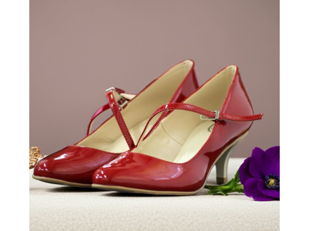 Šikmé zapínání přes nárt, výška podpatku je 5 cm.