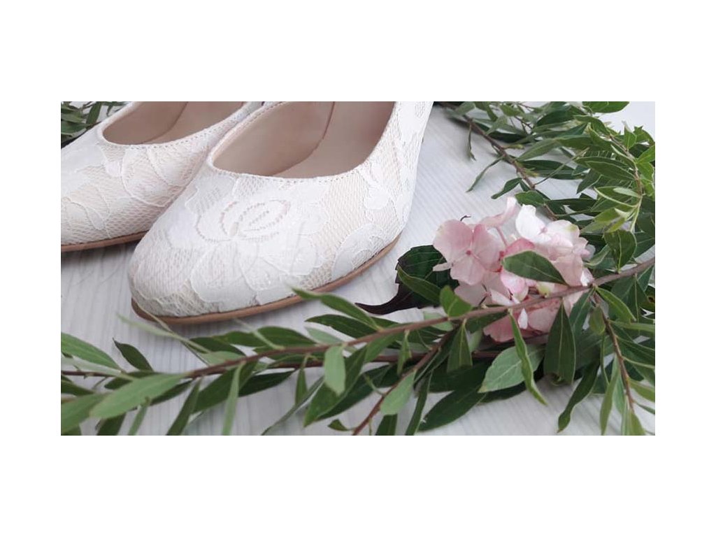 Saténové lodičky s páskem, potažené bílou krajkou.
