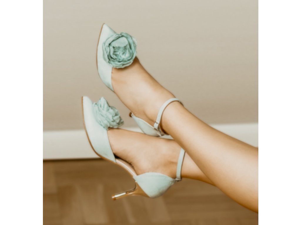 Semišové svatební boty s květinou - mentolové