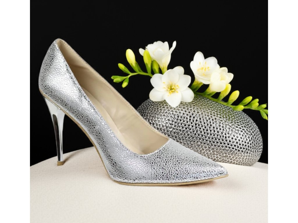 Stříbrný jehlový podpatek, výška podpatku je 9 cm.