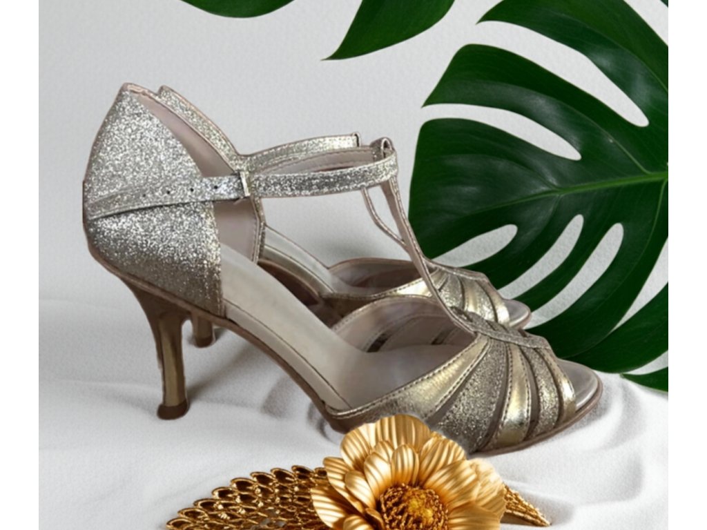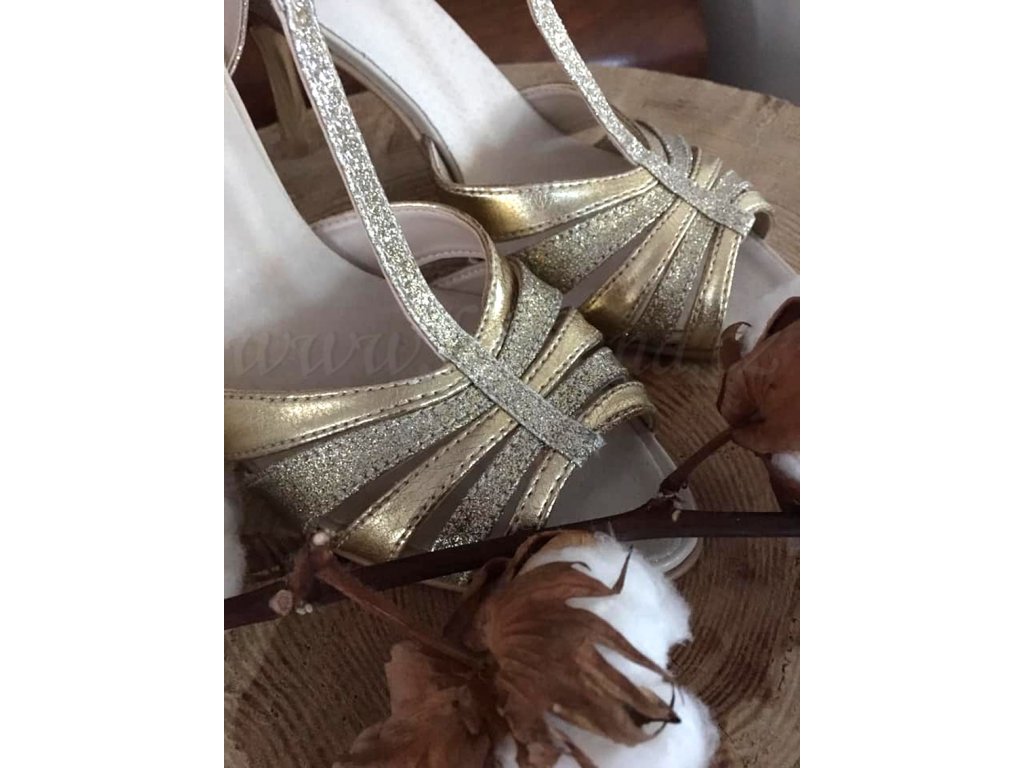 Svatební sandálky z ekokůže a zlaté třpytivé látky.