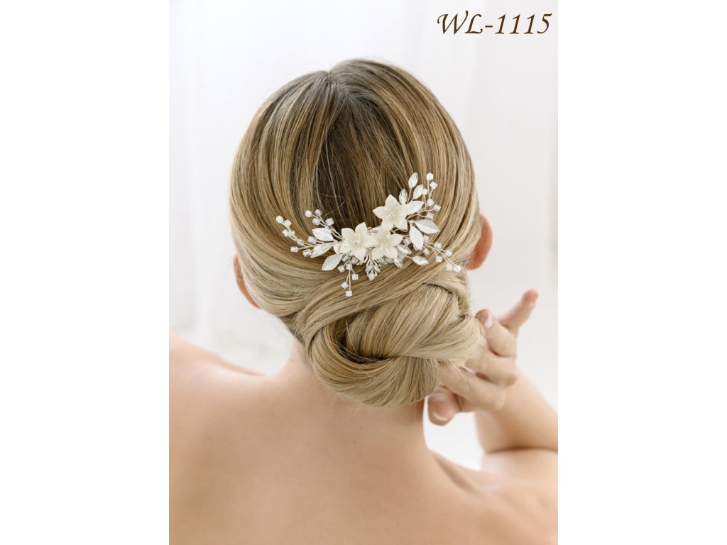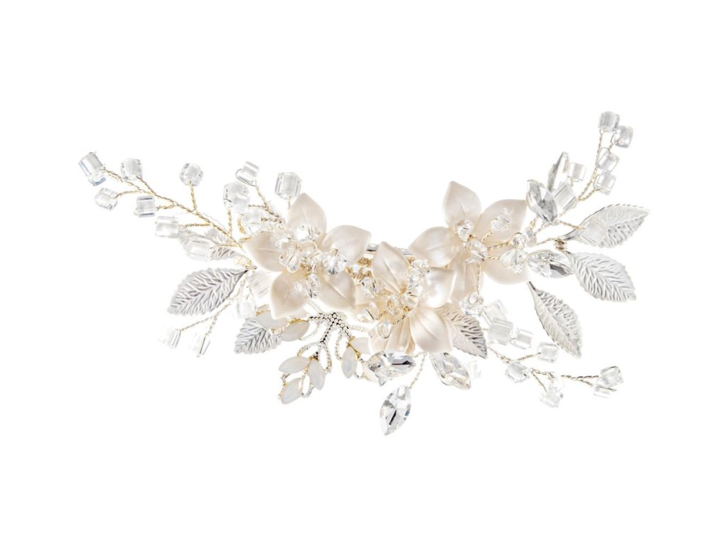 Svatební ozdoba do vlasů s bílými květy a korálky.