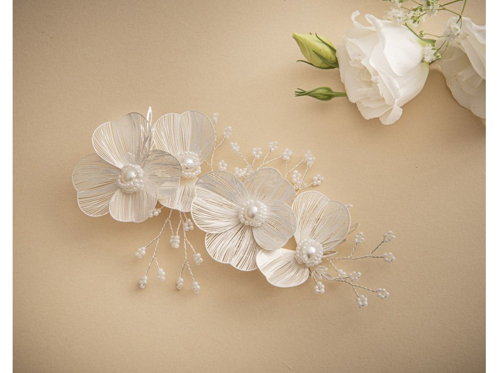 Krásná svatební spona do vlasů, zdobená 3D květy a slonovinovými perlami.
