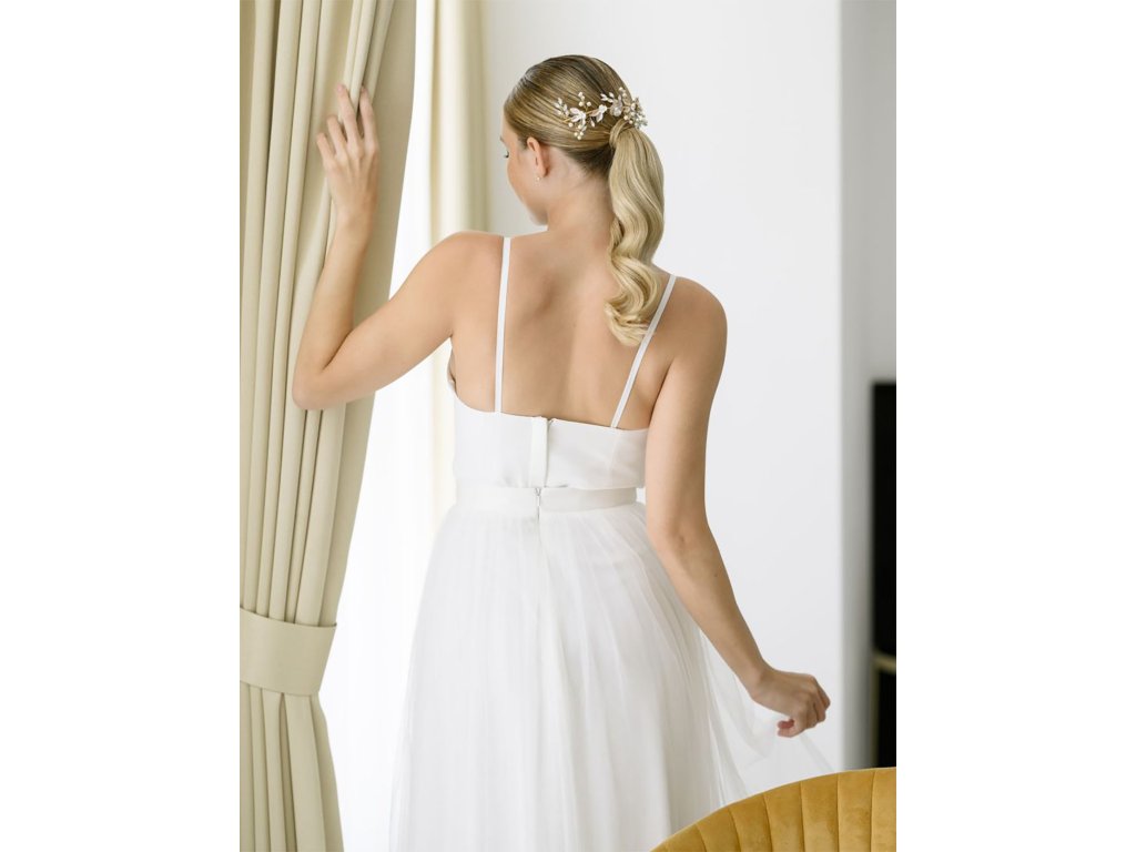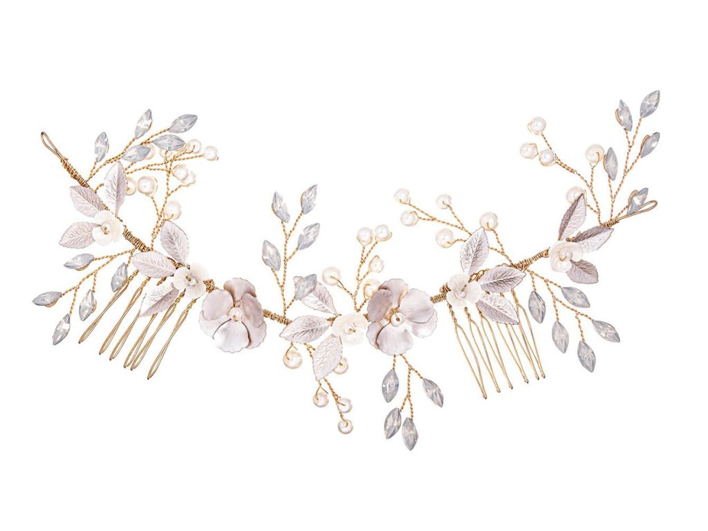 Jemný a elegantní svatební hřebínek do vlasů, zdobený krystaly a perlami.