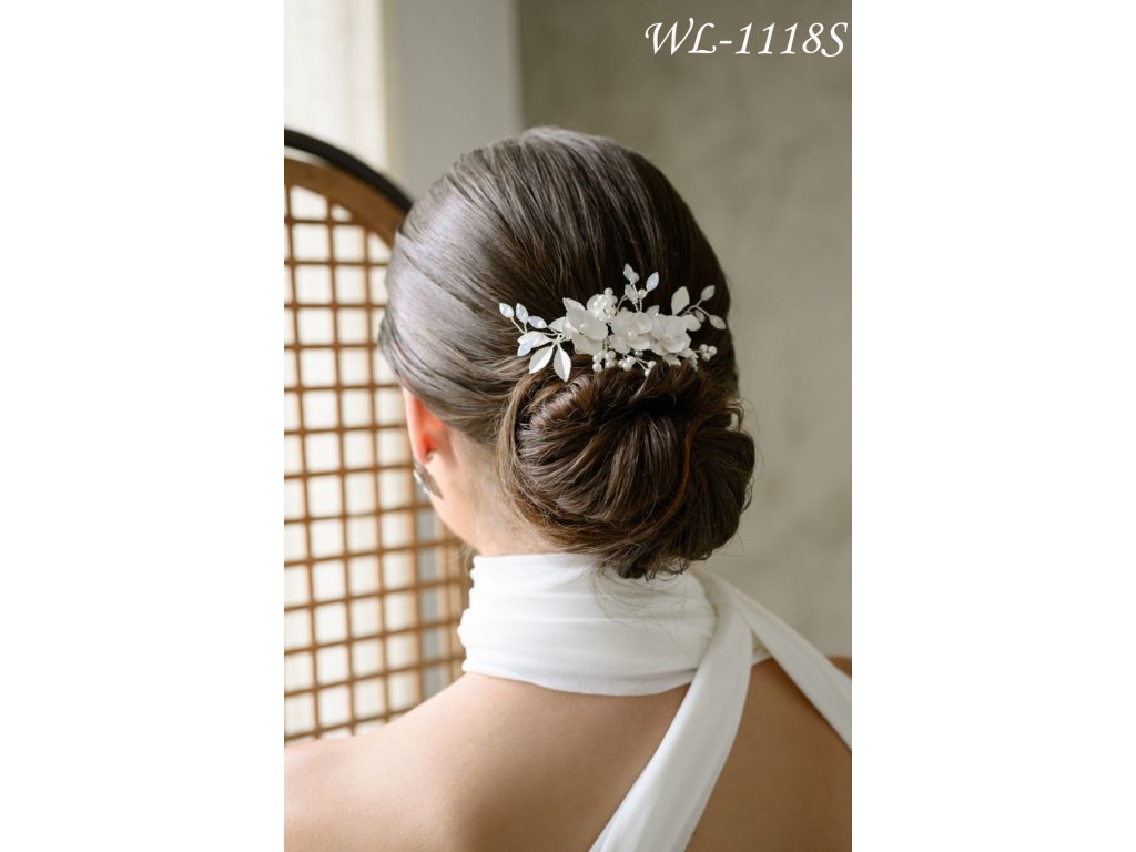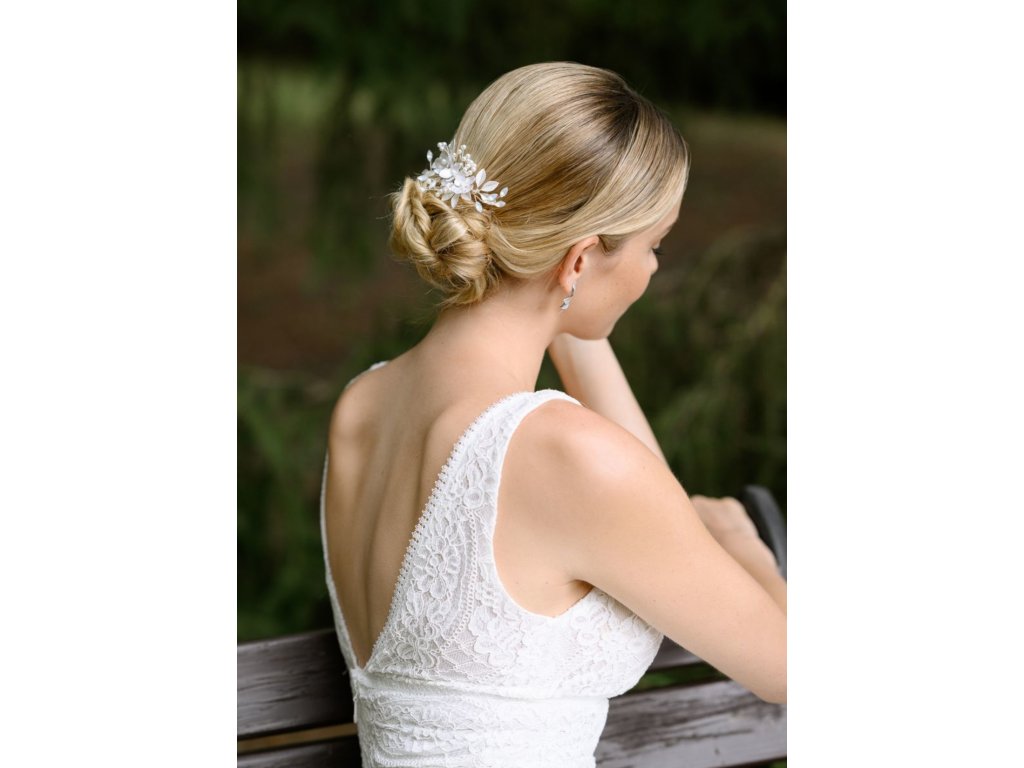 Krásná svatební spona do vlasů, zdobená 3D květy, lístky a slonovinovými perlami.