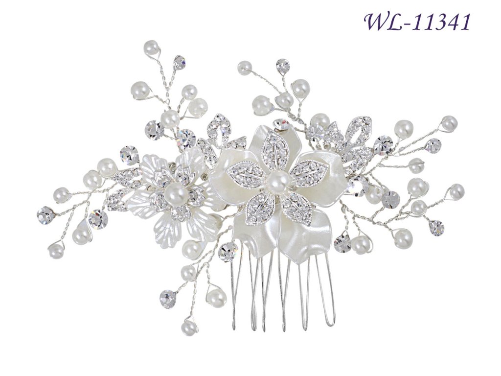 Ozdobný hřeben do vlasů s perleťovými květy a štrasem WL-11341