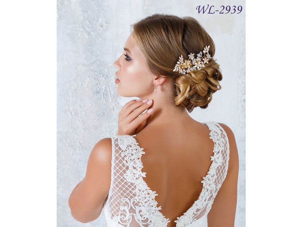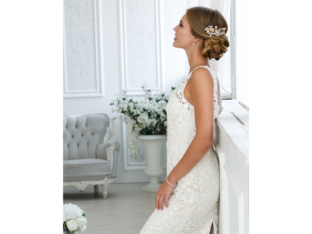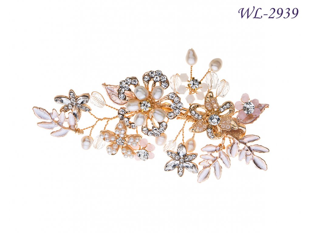 Zlatorůžová svatební spona se štrasem a perličkami WL-2939