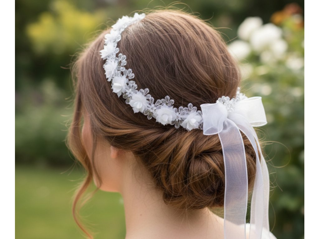Svatební věneček do vlasů s organzovou mašlí.