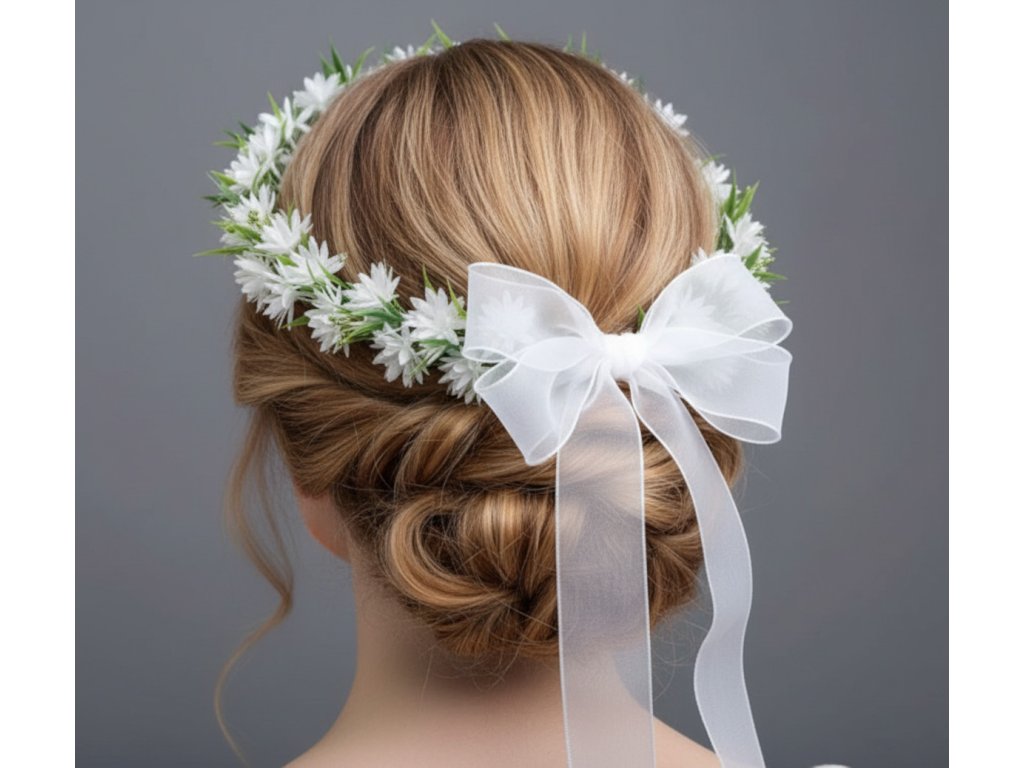 Svatební věneček do vlasů s organzovou mašlí.