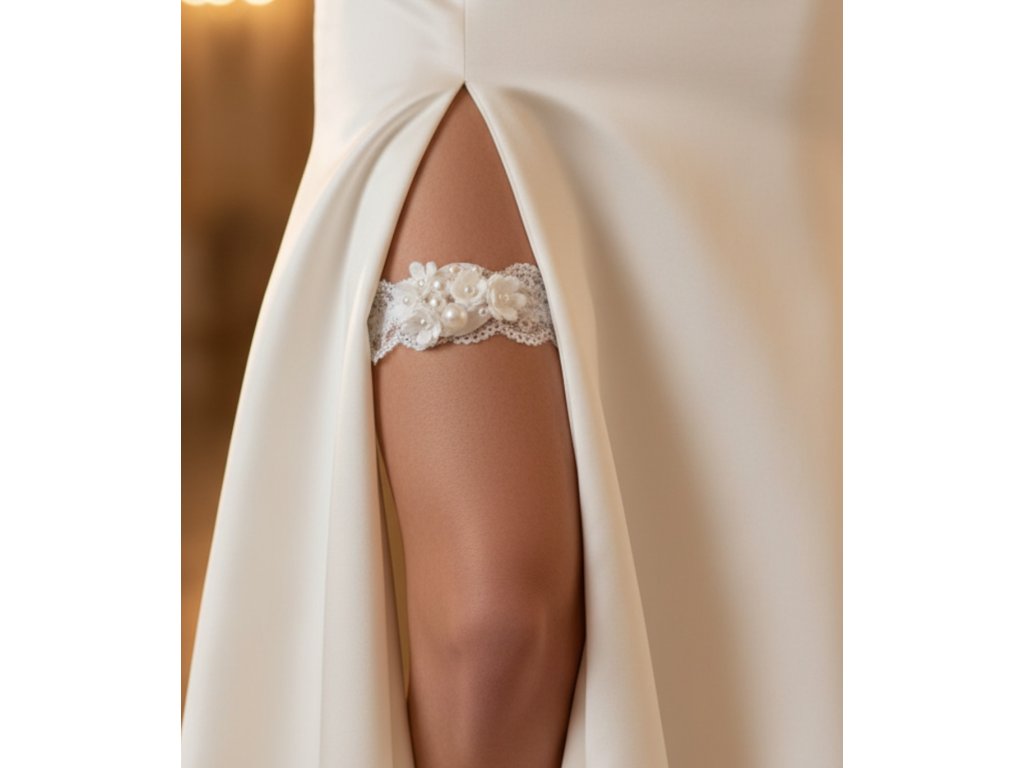Krajkový svatební podvazek s květy a perličkami PD-014