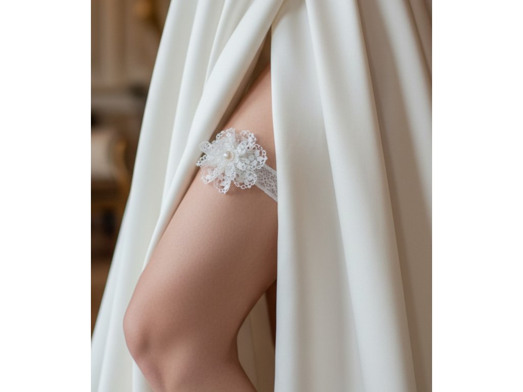 Svatební podvazek s krajkovou květinou.