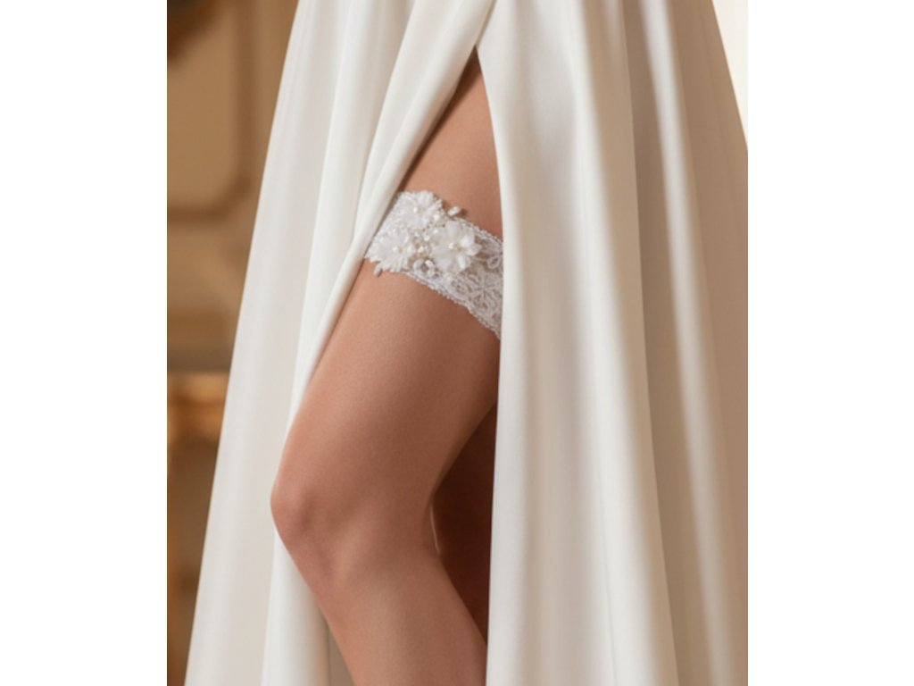 Svatební krajkový podvazek s květy a perličkami.
